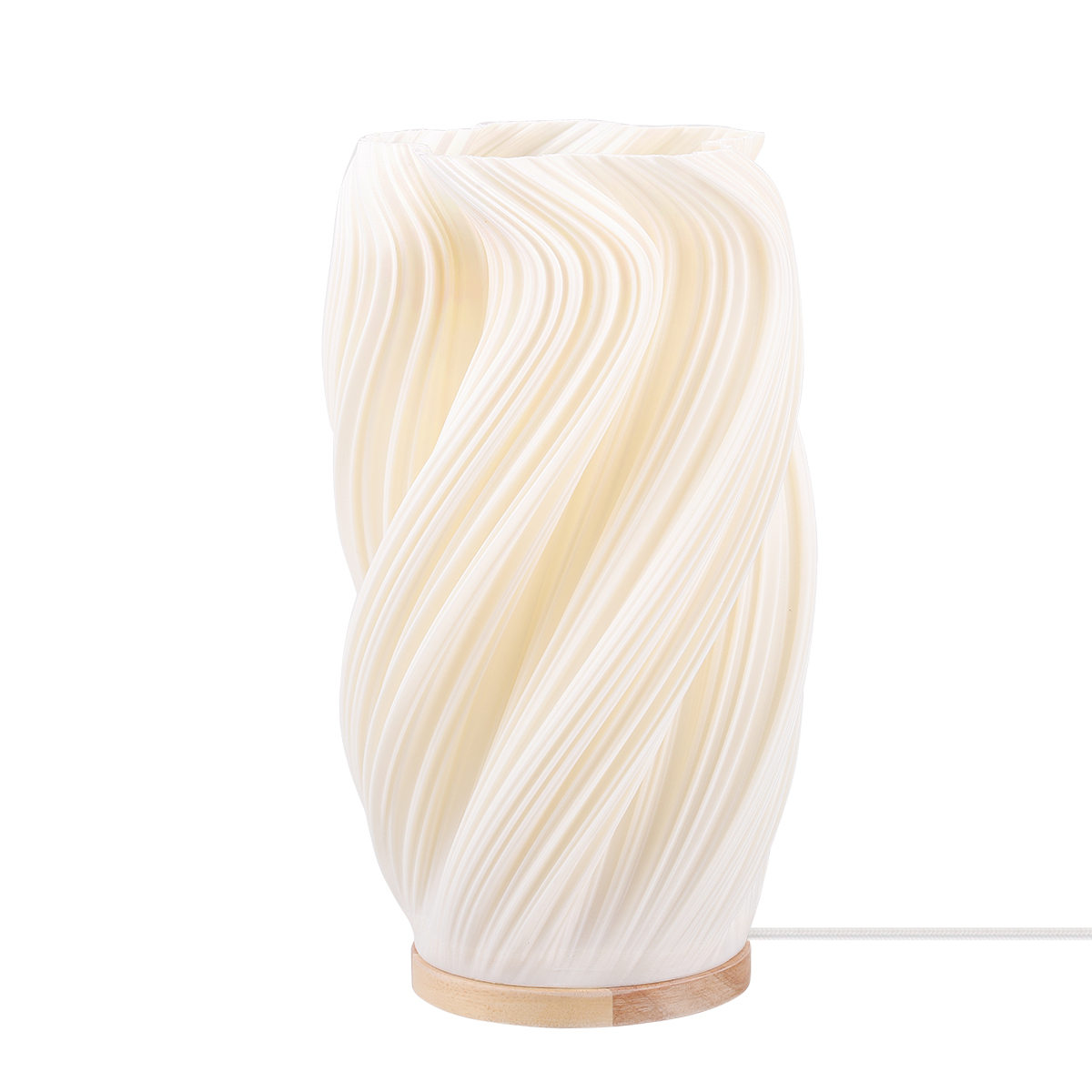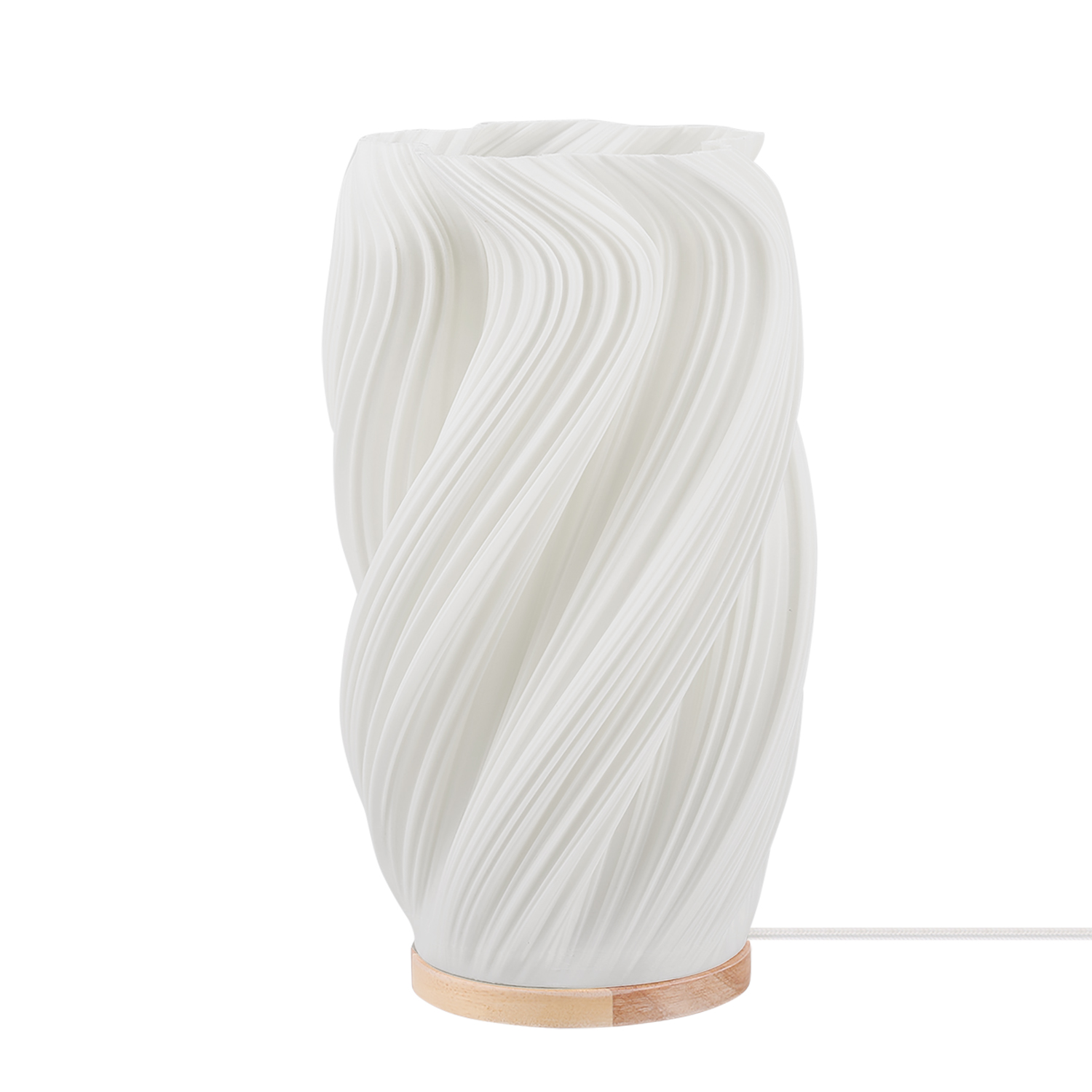 E27 Max 10W, bulb not included. White 3D-printed plastic lampshade. 1.8M white textile cable with inline on/off switch and EU plug.
