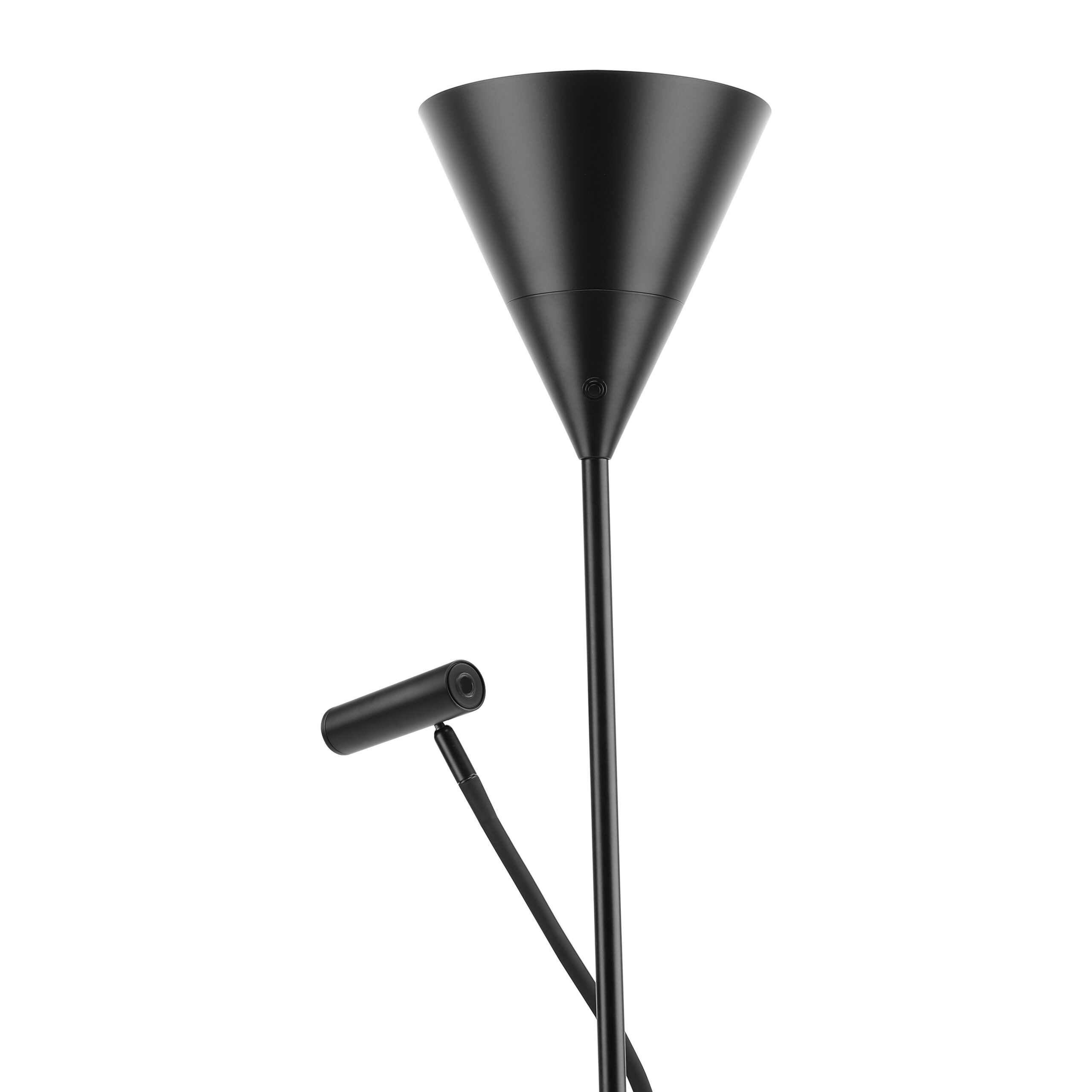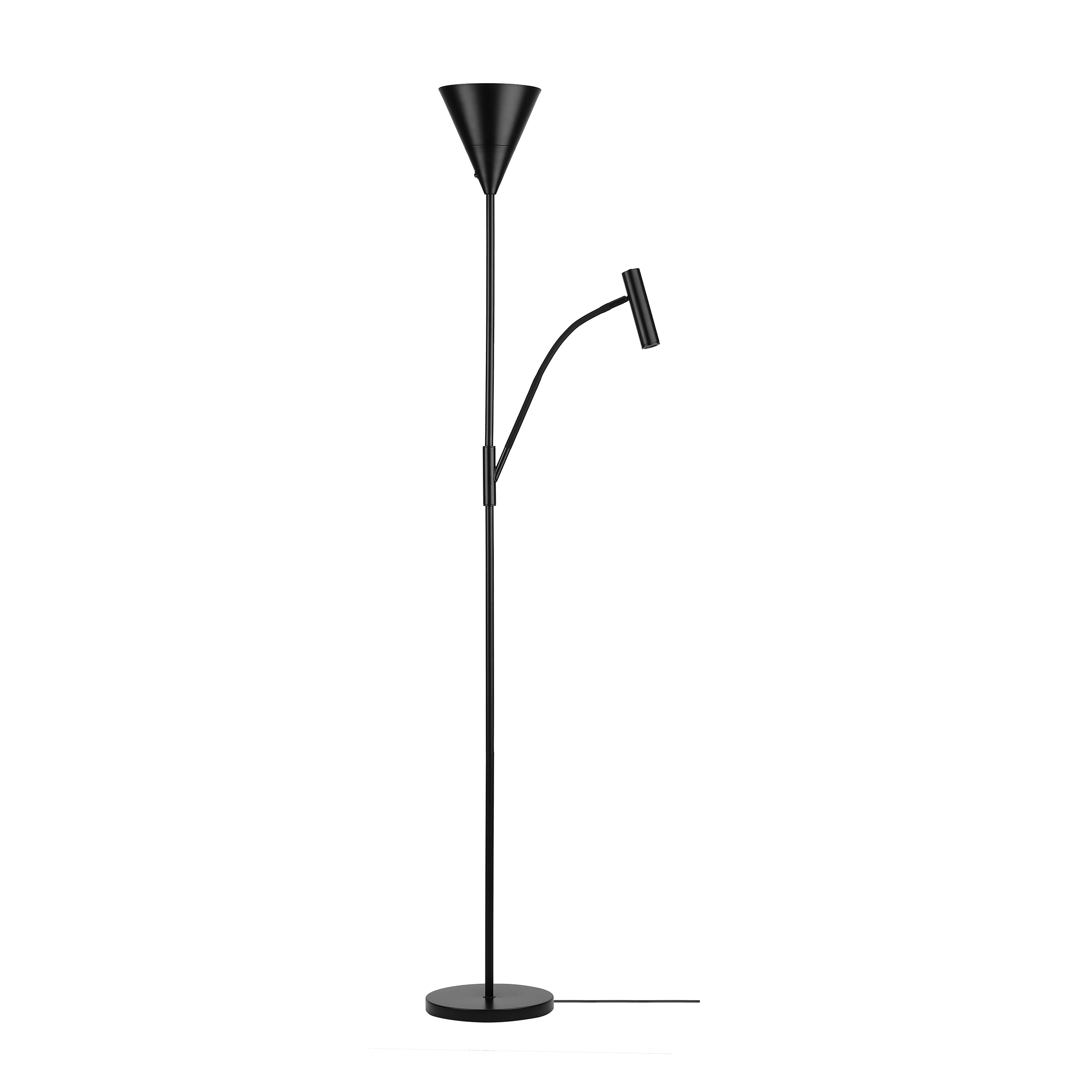 VIDE Floor Lamp Mother: E27 Max.46W, bulb not included. Push on/off switch on Lampcup. Son: 1304 COB, 6W, 400lm, 3000K, RA82. Push on/off switch on head. Matte black. 2m textile cable with EU plug. Product Size: 47x25xH179cm